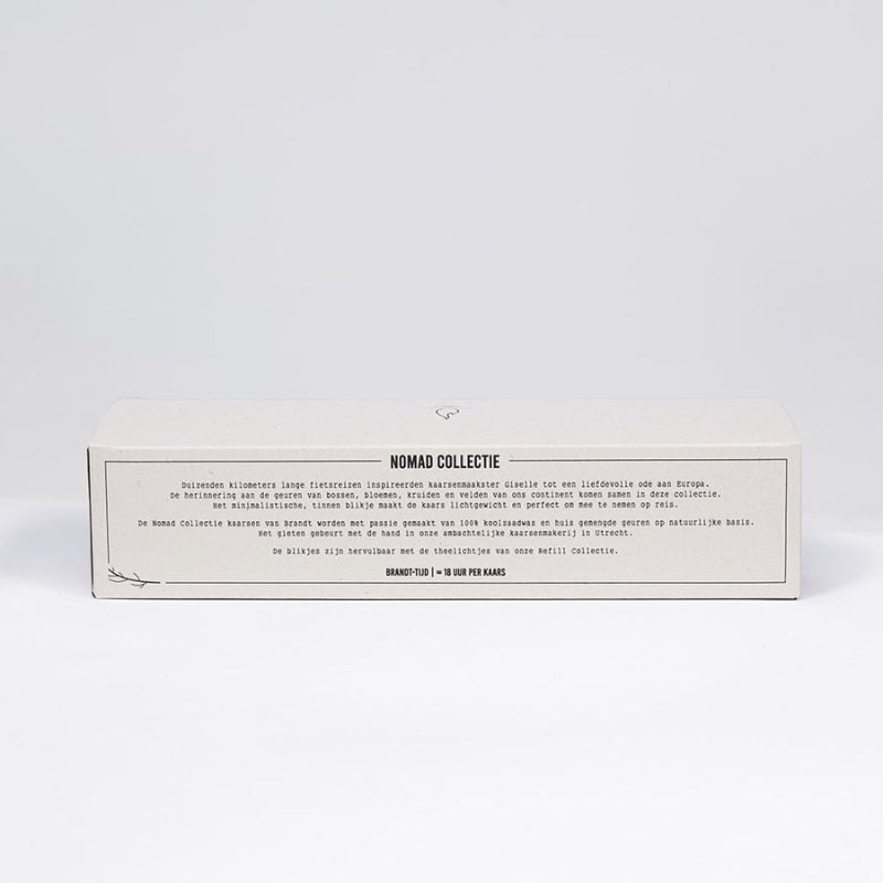 Duizenden kilometers lange fietsreizen inspireerden kaarsenmaakster Giselle tot een liefdevolle ode aan Europa. De herinnering aan de geuren van bossen, bloemen, kruiden en velden van ons continent komen samen in deze collectie. Het minimalistische tinnen blikje maakt de kaars (een) lichtgewicht en perfect om mee te nemen op reis. De kaarsen zijn gemaakt van 100% koolzaadwas en komen in een doosje van landbouwafval.