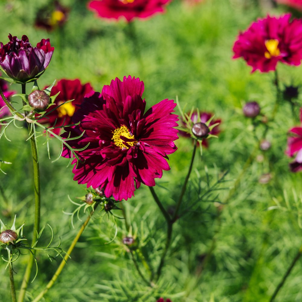 We maken er hier geen geheim van dat we héél erg houden van cosmea. We plukken er het állerliefst armenvol van. Er is oprecht niets te vergelijken met die kwetsbare bloemblaadjes, zo dun dat het zonlicht er doorheen breekt. Je kunt er eindeloos van plukken, daar groeit ze alleen maar sneller van. Echt, al zaai je maar één soort: laat het cosmea zijn. 'Double Click Cranberries’ is bijzonder van kleur en prachtig gevuld.