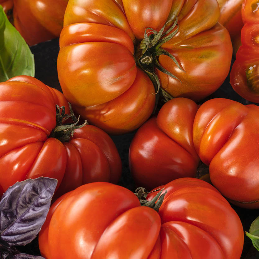 Zeg je zomer, dan zeg je tomaten. Wat is er nou heerlijker dan iedere dag even de tuin in lopen om een handjevol tomaten voor het eten te plukken? Reuzentomaat 'Coeur de Boeuf', ossenhart in het Nederlands, is een bijzondere soort. De ietwat onsmakelijke naam heeft ze te danken aan haar unieke vorm en grootte. Eén tomaat kan tot wel 500 gram wegen! Ze rijpt van binnen naar buiten, waardoor je haar het beste oogst als ze nog ietwat groen ziet. Werkelijk een prachtige tomaat, zowel in je tuin als op je bord.