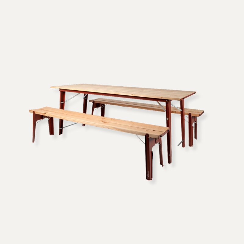 Ontworpen door Jaïr Straschnow, is deze slimme interpretatie van de klassieke biertafel en -bank een ware upgrade. De Beerbench staat stevig door de zit met een hoek van zeven graden. Geen gewiebel, geen omvallen — altijd stabiel, ook op ongelijke ondergronden. De Salut Beerset bestaat uit één Beertable en twee Beerbenches, verkrijgbaar in Oxide Red.