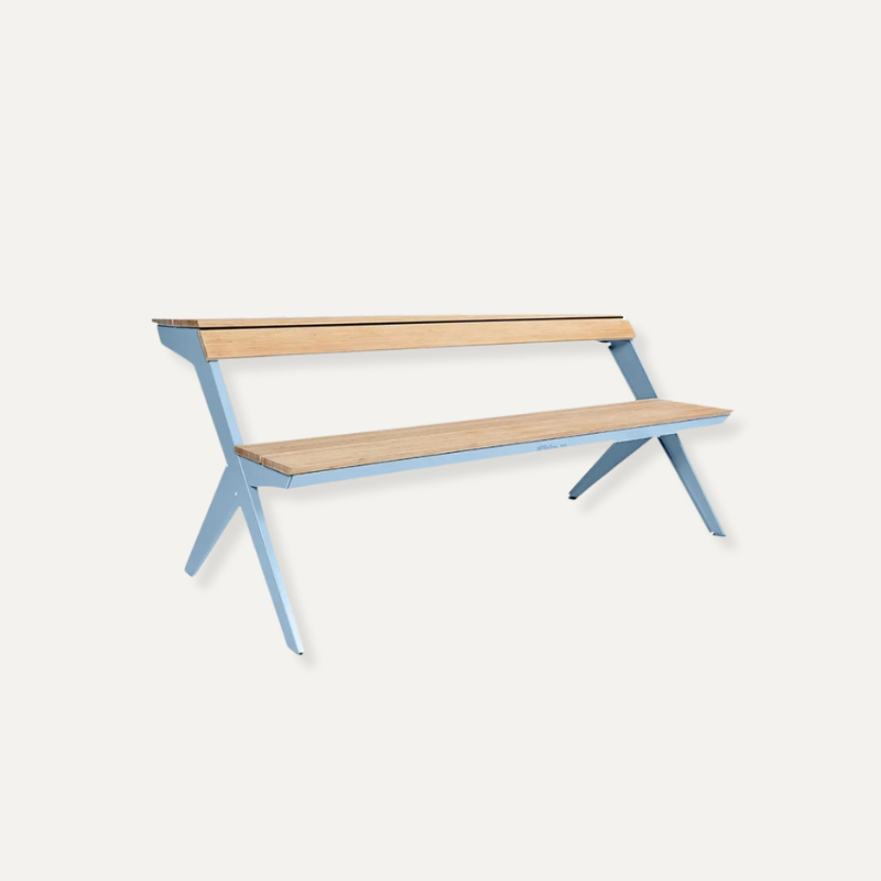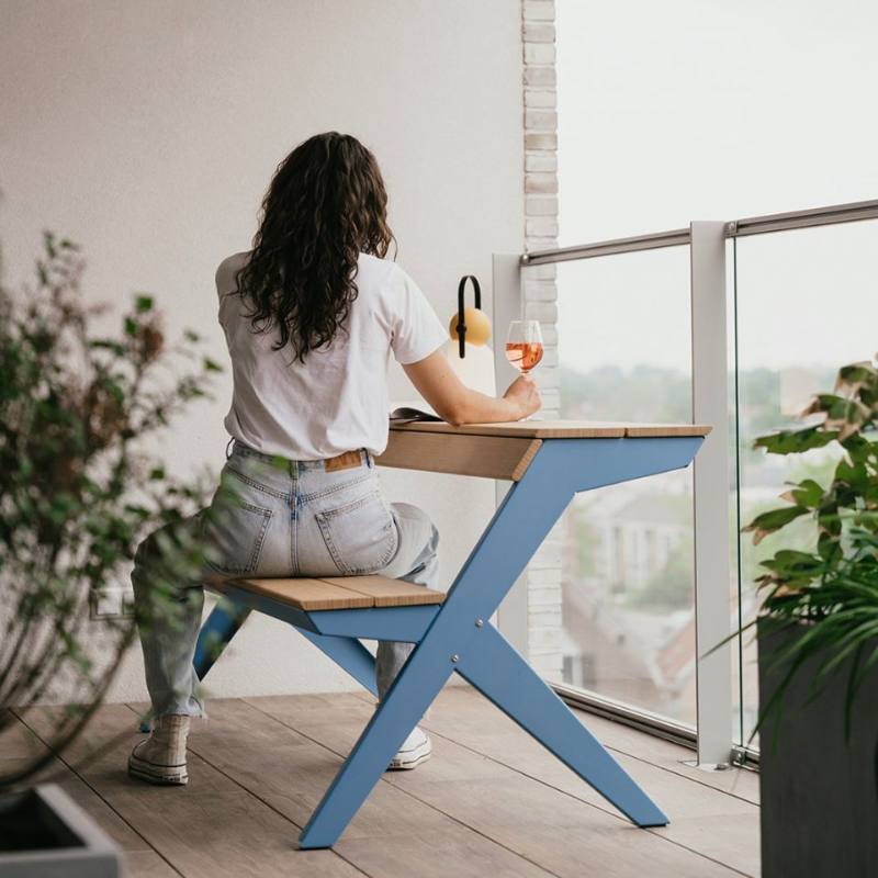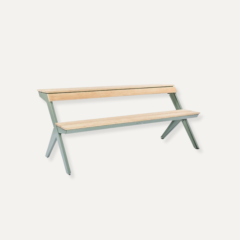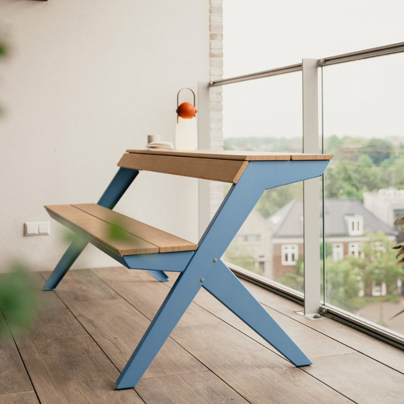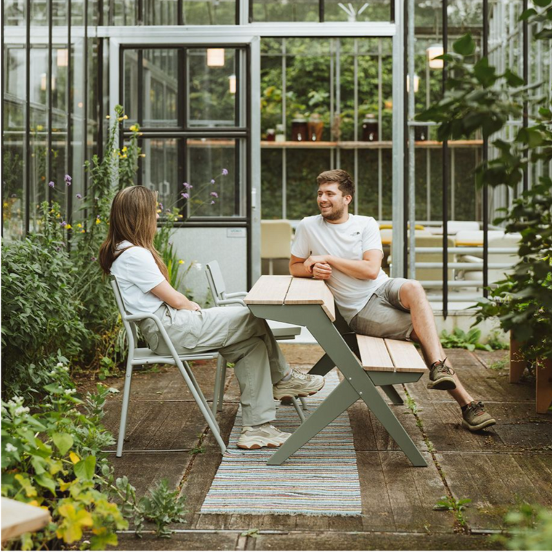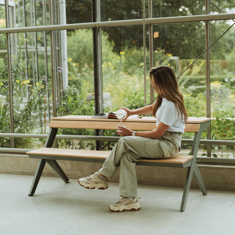 Door het ontwerp van een traditionele picknicktafel doormidden te snijden, ontstaat een multifunctionele zitplek die je moeiteloos inzet op een balkon, stadsplein of in de tuin. Gebruik de Tablebench als tafel mét rugleuning, als bank of combineer er twee tot een volledige picknicktafel. De gebogen tafelrand doet ook dienst als comfortabele rugleuning wanneer je de andere kant op zit. Werk, eet of ontspan – allemaal aan hetzelfde meubelstuk.