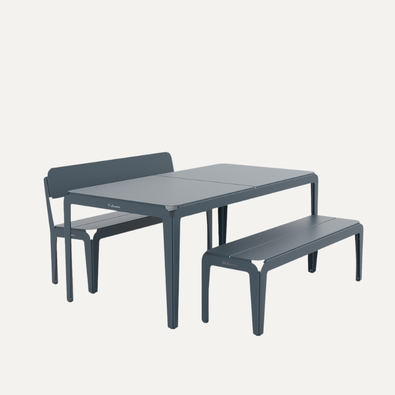 Met zijn minimalistische uitstraling en robuuste kwaliteit is deze set ideaal voor het terras, balkon of in de tuin. Of je nu dineert met vrienden of werkt in de buitenlucht: deze set staat altijd stevig.
