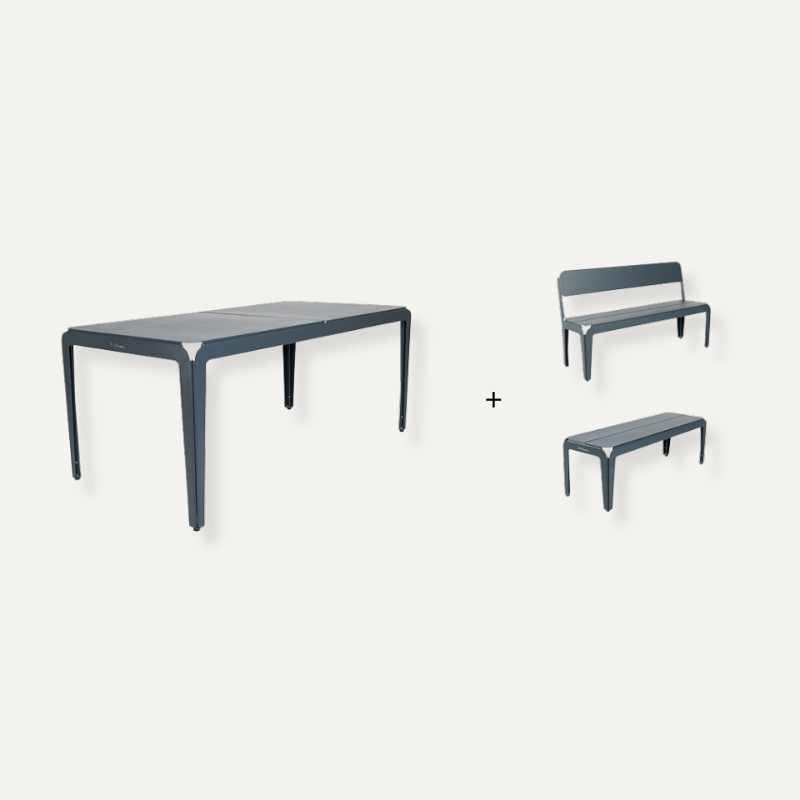 Met zijn minimalistische uitstraling en robuuste kwaliteit is deze set ideaal voor het terras, balkon of in de tuin. Of je nu dineert met vrienden of werkt in de buitenlucht: deze set staat altijd stevig.