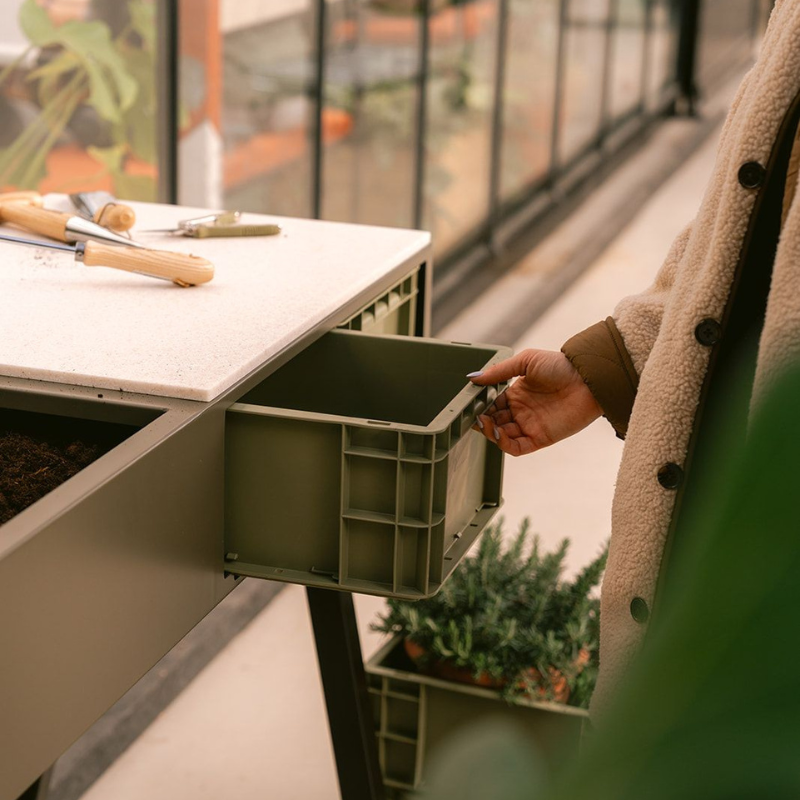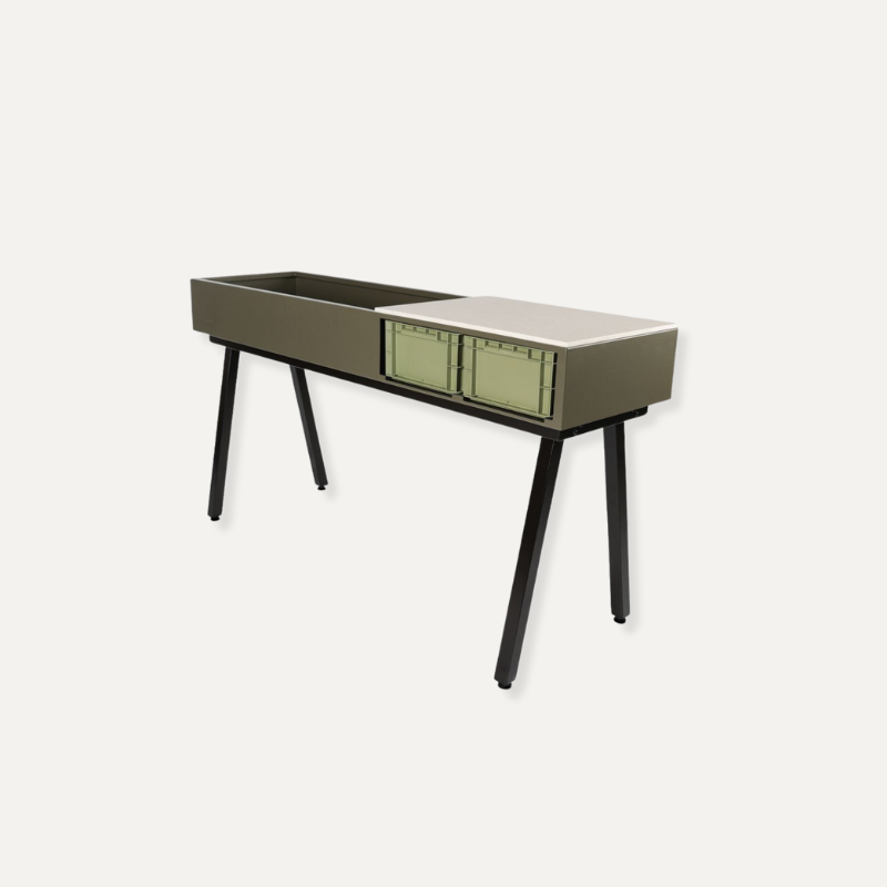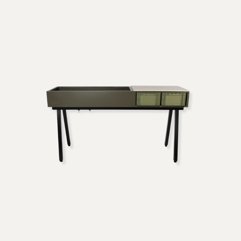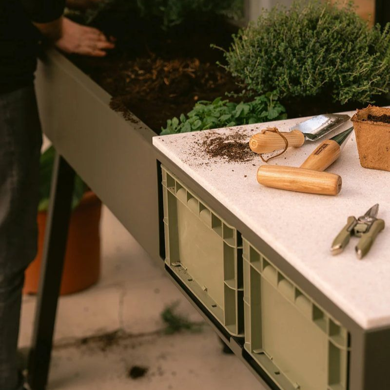 De Gardenworks Station is ontworpen met gebruik als uitgangspunt. Het station bestaat uit een plantenbak en een werkblad met een praktische werkhoogte van 93 cm. Onder het blad is ruimte voor twee kratten. Deze combinatie maakt de Gardenworks inzetbaar voor zowel tuinieren als buiten koken. Dankzij de afvoer in de bodem van de plantenbak blijft de aarde optimaal gehydrateerd: overtollig water loopt weg via twee uitgangen, terwijl er altijd een laagje water achterblijft voor de planten om uit te drinken. Zo geniet je altijd van goed verzorgde en gezonde planten.