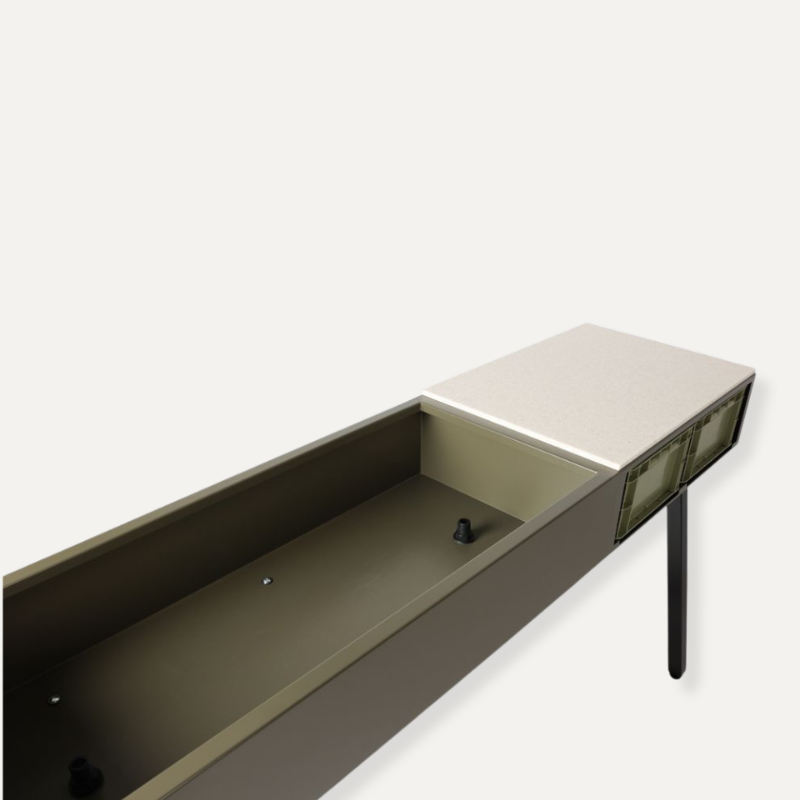 Het elegante en doordachte ontwerp vormt een balans tussen functionaliteit en esthetiek. De interactie tussen gebruiker en ontwerp brengt de omgeving tot leven. Of de Gardenworks Station nu op een balkon in de stad staat, binnenshuis wordt gebruikt om groen toe te voegen aan je interieur, of een plek heeft in een landelijke tuin – het plantstation voegt altijd waarde toe aan je leefomgeving.