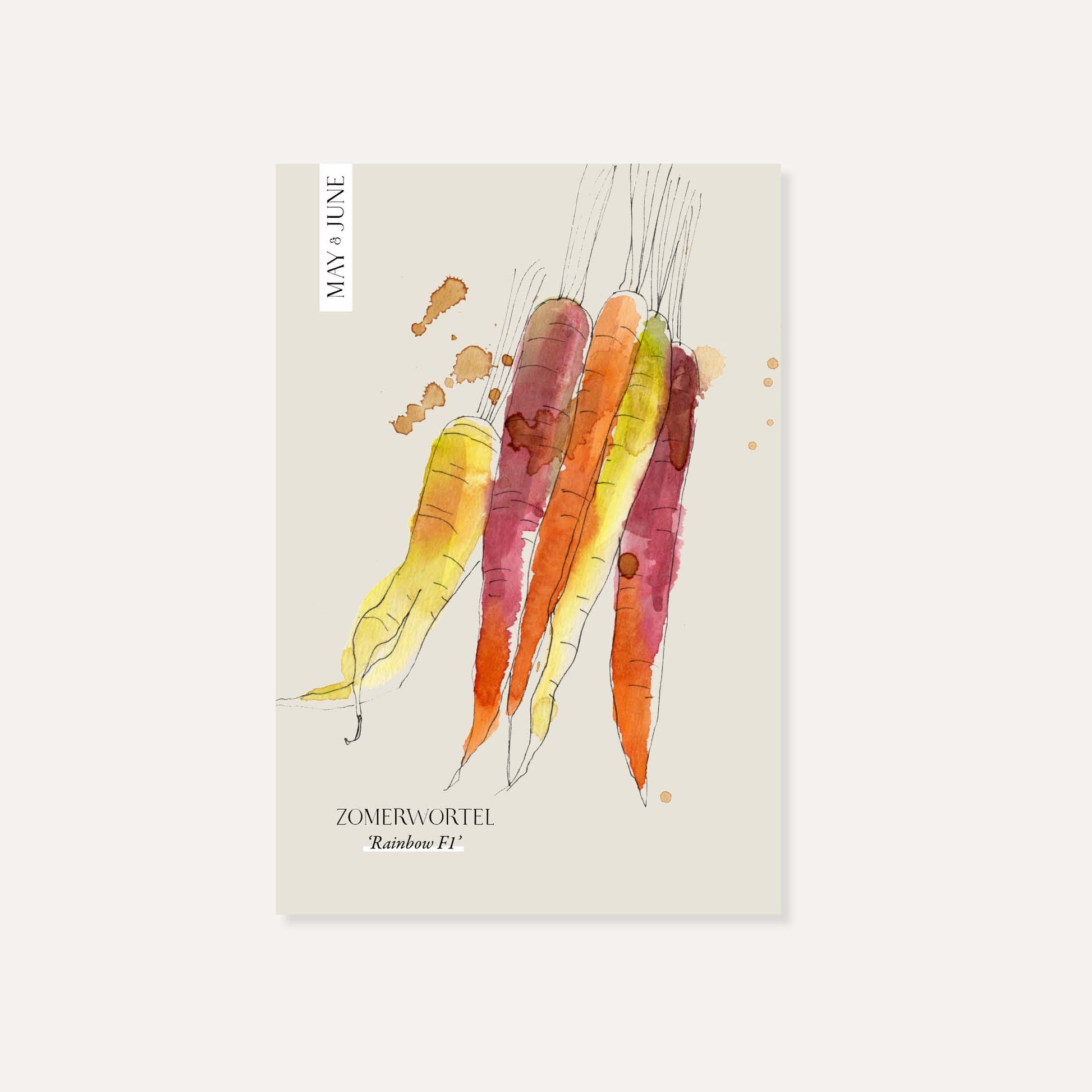 Wortels zaai je bij voorkeur op een verhoogde ‘rug’, een stukje grond dat tot een bultje is gemaakt. Als de grond goed los en luchtig is groeien wortels mooi recht en lang. Zaai een rijtje en dun na ontkiemen uit tot een afstand van ca. 5 cm. Voor dikkere wortels kun je er meer ruimte tussen laten. Tussen de rijen laat je ca. 20 cm ruimte. Direct zaaien kan tussen maart en juli. Voor een langere oogst zaai je meerdere keren. Gebruik insectengaas om de planten af te dekken om ze te beschermen tegen de wortelvlieg.