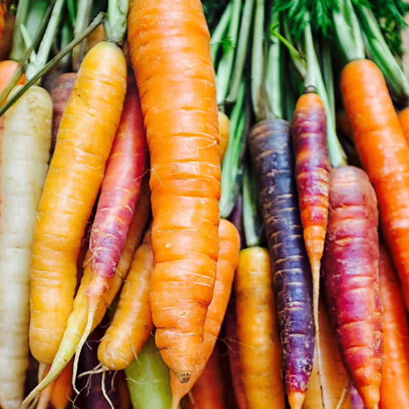 Hoe leuk zijn deze regenboogkleurige wortels? Vroeger teelde men allerlei kleuren wortels, totdat de Oranjes de oorlog van de Spanjaarden wonnen in de zeventiende eeuw en de Hollandse handelaren alleen nog maar oranje wortels verkochten. Deze regenboogwortels zijn lekker vrolijk en een feestje op je bord!