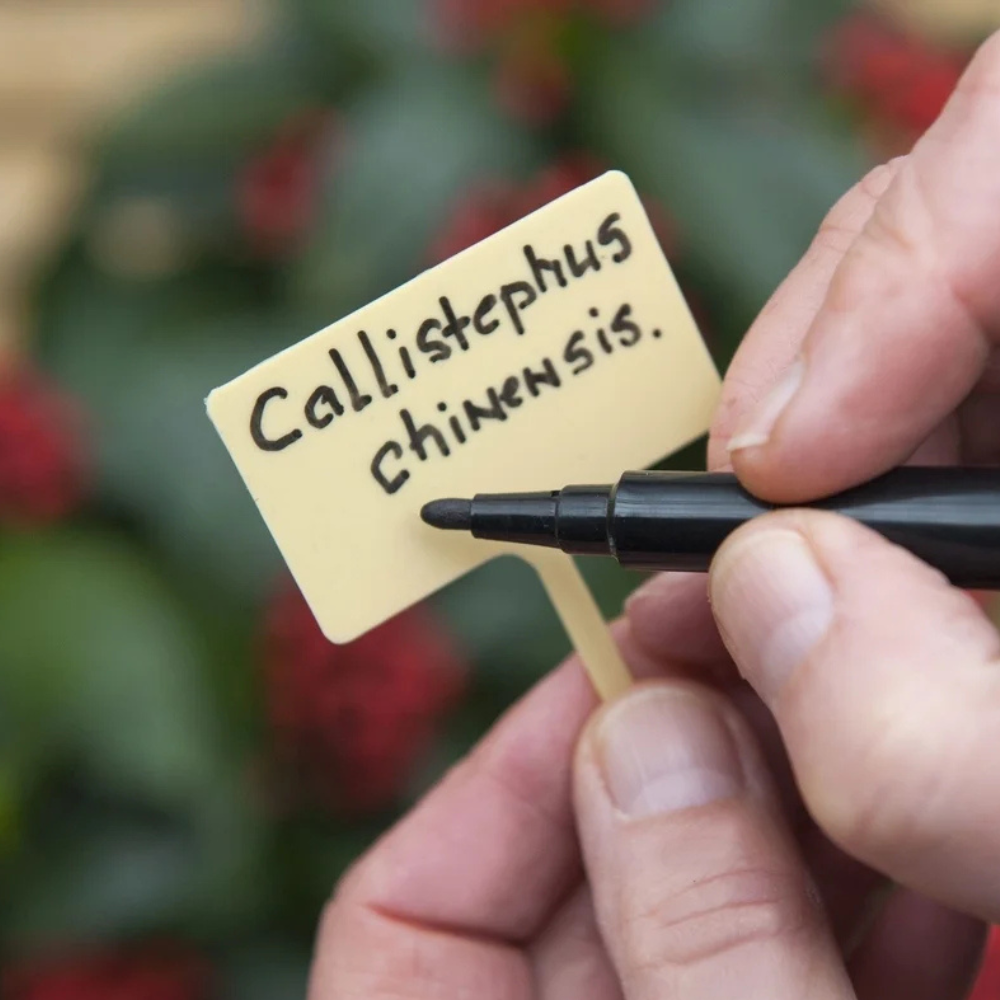 Met hun fijne punt schrijf je moeiteloos op sleufetiketten voor bv. dahlia's of vaste planten of andere plantenlabels. De inkt droogt snel, vlekt niet en blijft leesbaar. Handig om namen van dahlia’s, vaste planten of zaaibakken vast te leggen, zodat je ook volgend jaar nog weet wat waar stond.