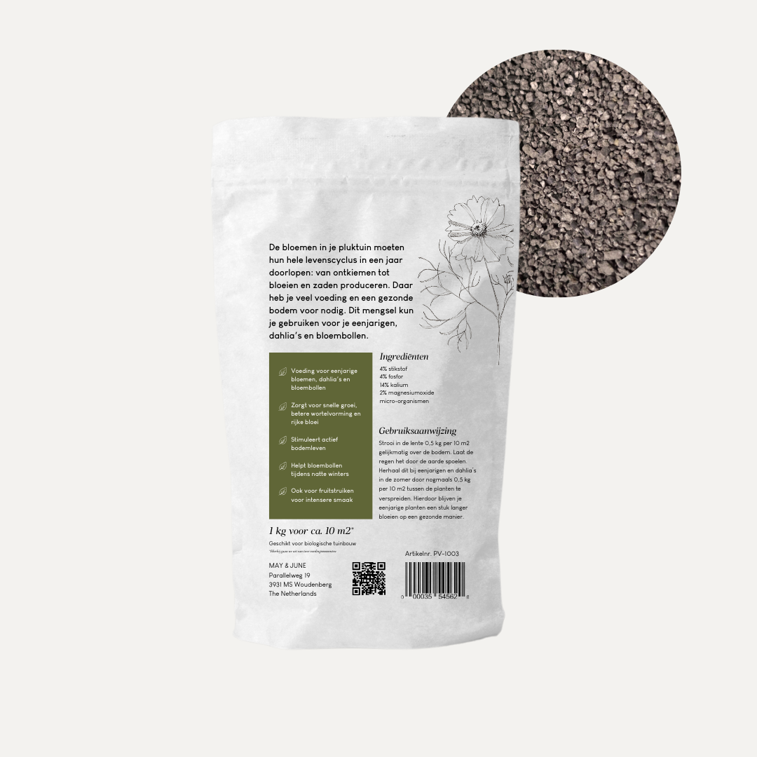 De bloemen in je pluktuin moeten hun hele levenscyclus in een jaar doorlopen: van ontkiemen tot bloeien en zaden produceren. Daar heb je veel voeding en een gezonde bodem voor nodig. Dit mengsel kun je gebruiken voor je eenjarigen, dahlia’s en bloembollen.