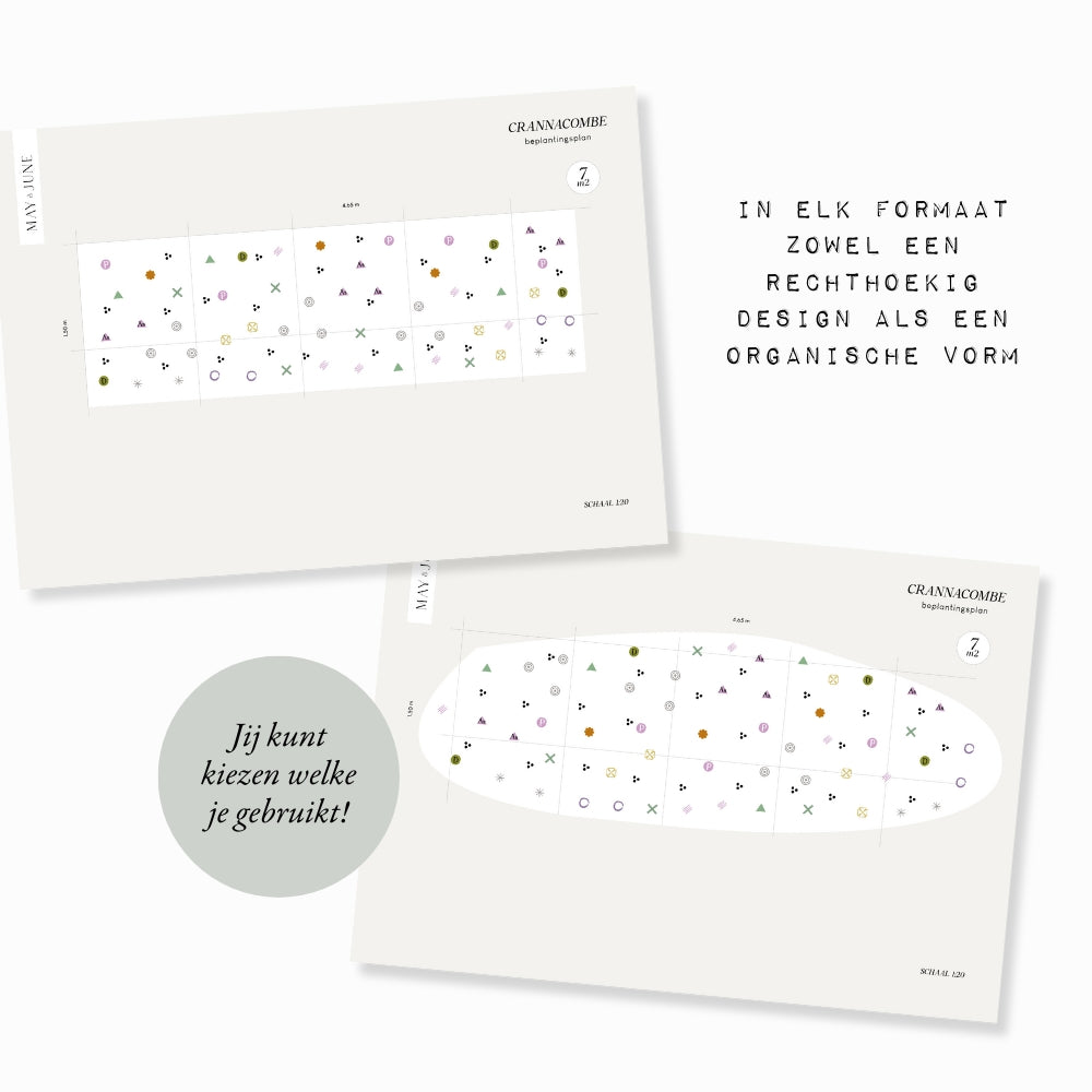 Bij een borderpakket ontvang je een download met twee tekeningen: één voor een rechthoekige border, en één voor een organische vrijstaande vorm. Je kunt dus zelf kiezen welke het beste past in je tuin. Natuurlijk kun je ook zelf nog een beetje schuiven met de indeling. Zolang je ongeveer de verhoudingen aanhoudt in het plan kun je niet zoveel fout doen.