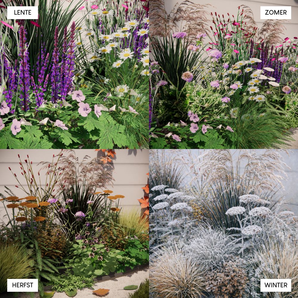 Binnen enkele maanden zie je de eerste groei, maar het eerste jaar gebruiken de planten vooral om zich stevig te wortelen. Dat is een belangrijke investering: zo bouwen ze kracht op voor de seizoenen daarna. In het tweede jaar zie je de border echt tot bloei komen en vallen alle planten prachtig samen in verhouding.