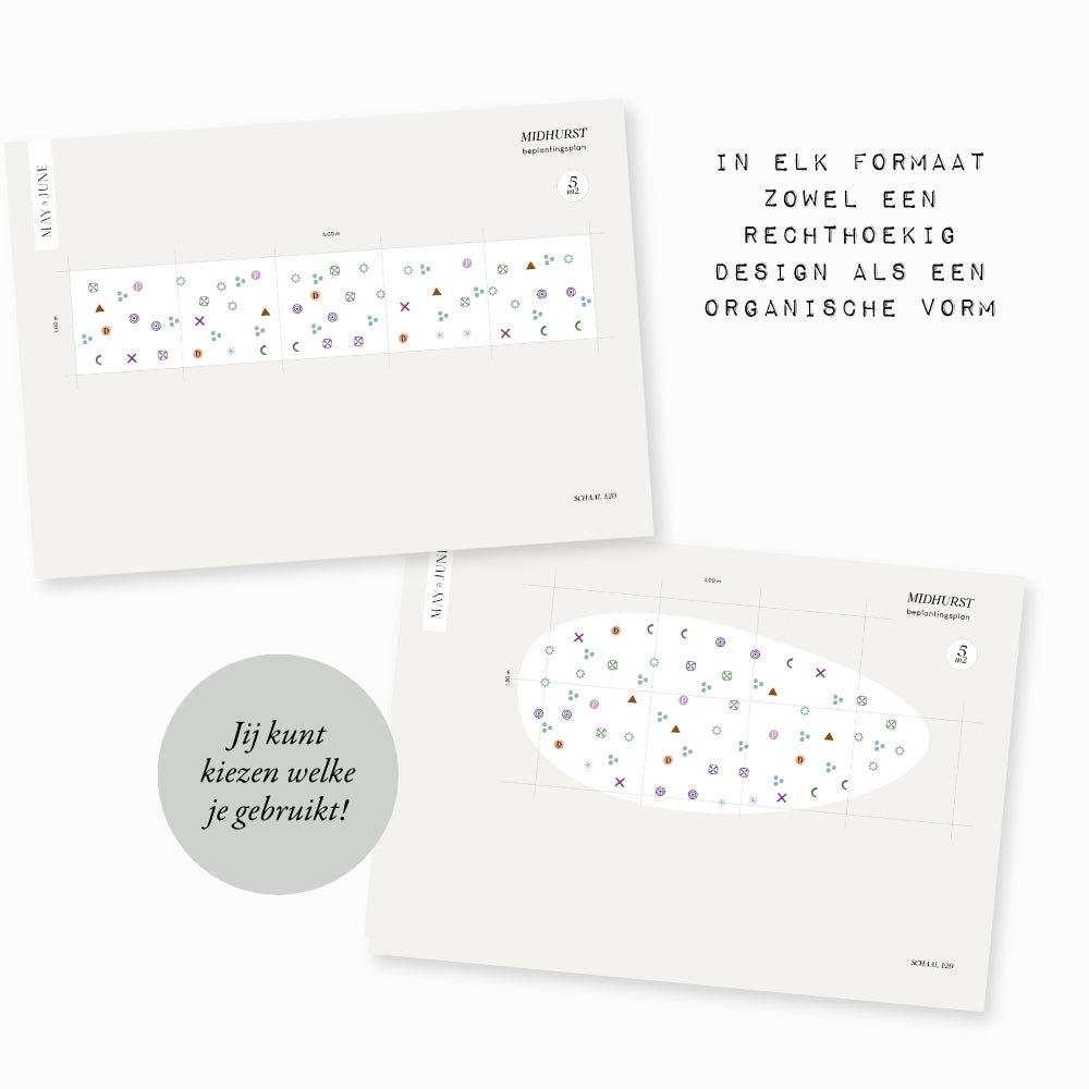 Bij een borderpakket ontvang je een download met twee tekeningen: één voor een rechthoekige border, en één voor een organische vrijstaande vorm. Je kunt dus zelf kiezen welke het beste past in je tuin. Natuurlijk kun je ook zelf nog een beetje schuiven met de indeling. Zolang je ongeveer de verhoudingen aanhoudt in het plan kun je niet zoveel fout doen.