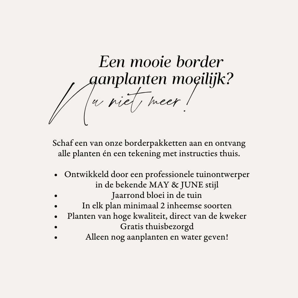 Elk borderpakket is ontworpen door tuinontwerper, schrijver en MAY & JUNE-oprichter Judith van Lent. Ze staat bekend om haar lagentheorie. Elke plant heeft een specifieke rol binnen een beplantingsplan in één van de vier lagen: structuurlaag, seizoenslaag, bodemlaag en vullerlaag. De borderpakketten zijn daarmee professioneel ontwikkeld. Waar andere partijen simpelweg vijf soorten planten in grote groepen bij elkaar zetten, is dit een beplantingsplan met dezelfde zorg en expertise waarmee we al jaren tuinliefhebbers helpen. En dat voor een heel vriendelijke prijs mét planten!