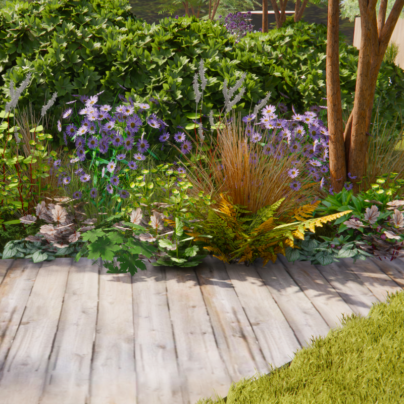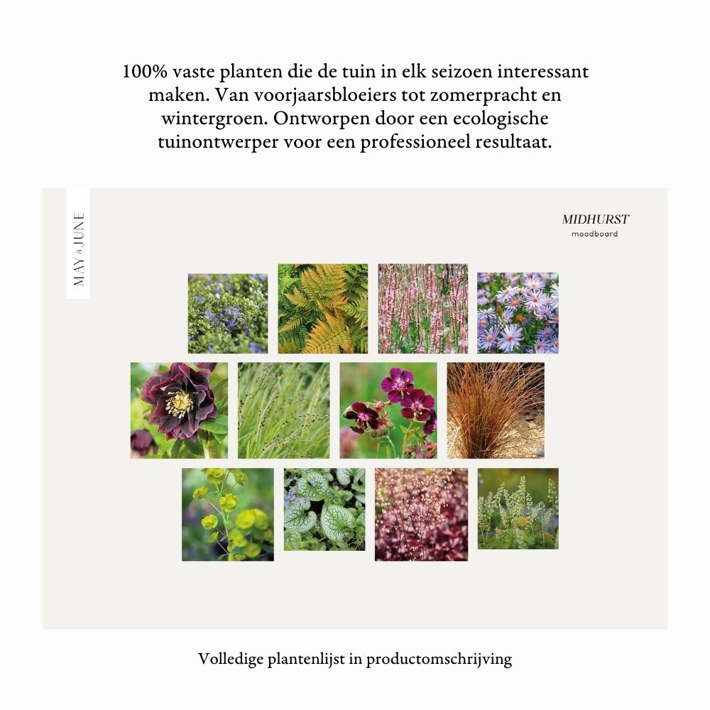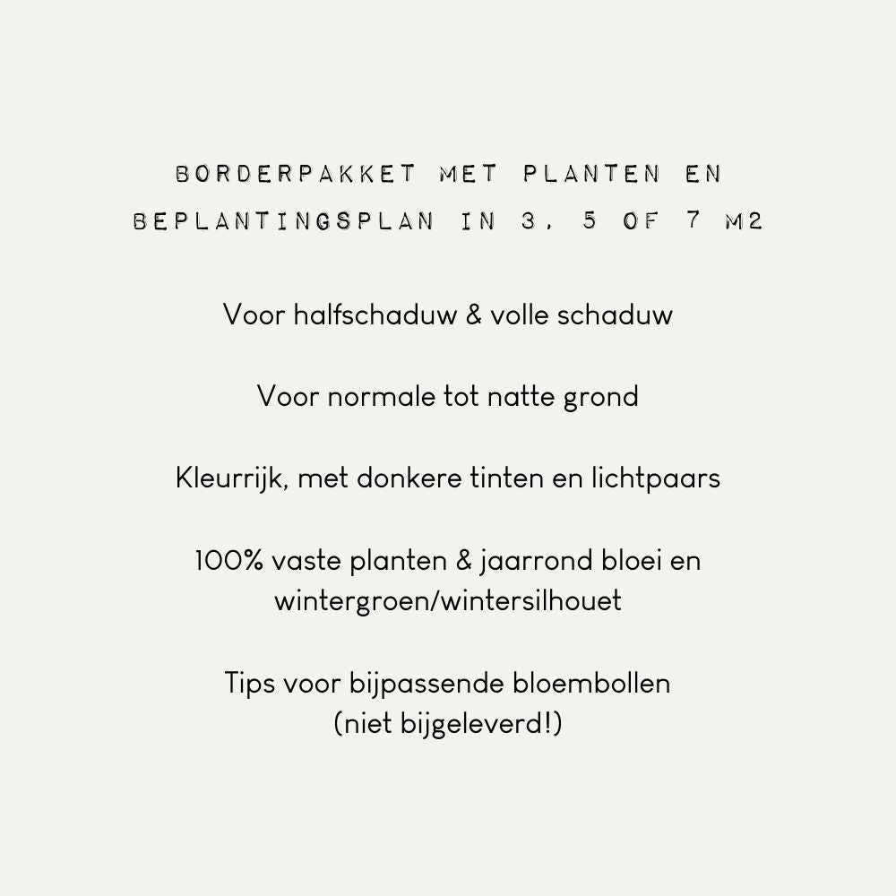 Een border in de schaduw hoeft helemaal niet saai te zijn! Borderpakket MIDHURST bewijst dat. Deze kun je het beste in volle schaduw of halfschaduw aanplanten. De soorten die je hierin vindt doen het goed op normale tot natte grond, maar niet op uitdrogende stukken. De kleuren zijn vrij diep, met mooie roodpaarse tinten en verkleurend blad van onder andere Dryopteris erythrosora (herfstvaren) en Geranium phaeum (ooievaarsbek).