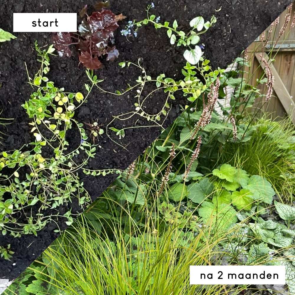 Binnen enkele maanden zie je de eerste groei, maar het eerste jaar gebruiken de planten vooral om zich stevig te wortelen. Dat is een belangrijke investering: zo bouwen ze kracht op voor de seizoenen daarna. In het tweede jaar zie je de border echt tot bloei komen en vallen alle planten prachtig samen in verhouding.