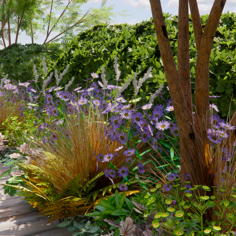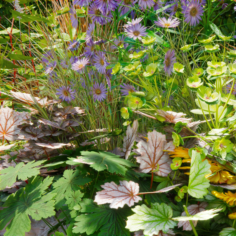 De planten in dit borderpakket hebben wisselende hoogtes. De hoogste soort is Aster 'Little Carlow' met zo'n 100 cm.