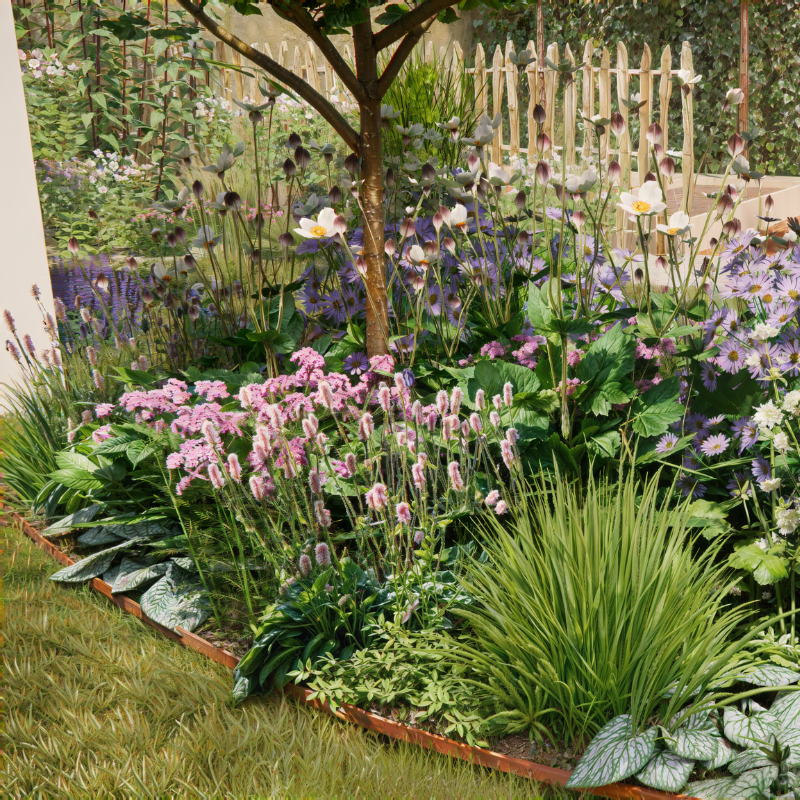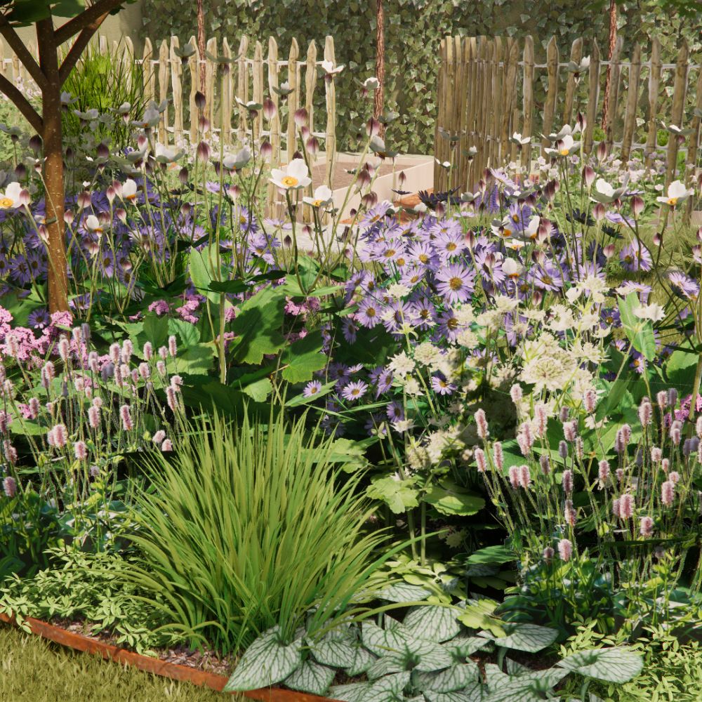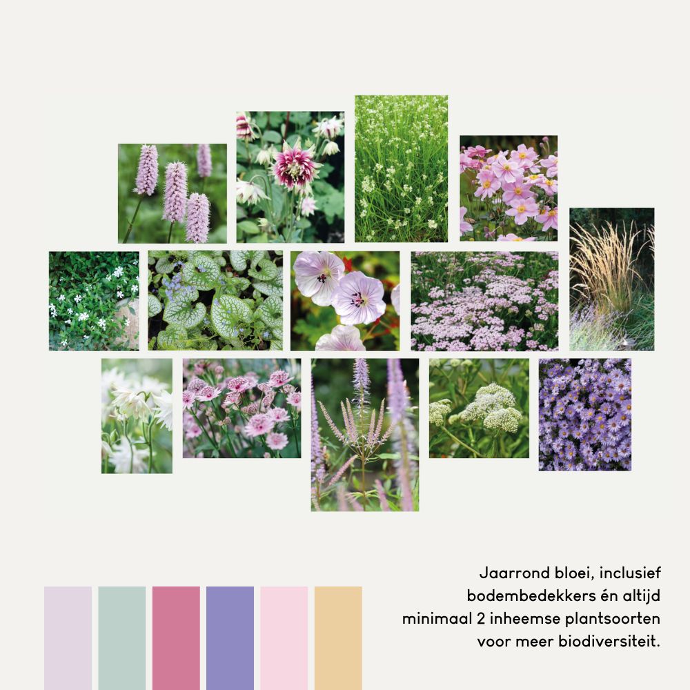 Een romantische border vol paarse, witte en roze tinten: met Rosemoor zit je dan goed. Zet dit borderpakket op een vrij zonnige plek, al wordt een beetje halfschaduw ook wel verdragen. De pastelkleuren doen het heel goed in een Engelse cottagetuin, maar als je die niet hebt worden de planten net zo mooi!De planten in dit borderpakket hebben wisselende hoogtes. De hoogste planten in dit type pakket zijn Aster 'Little Carlow' met 100 cm en Calamagrostis 'Karl Foerster' met 160 cm.