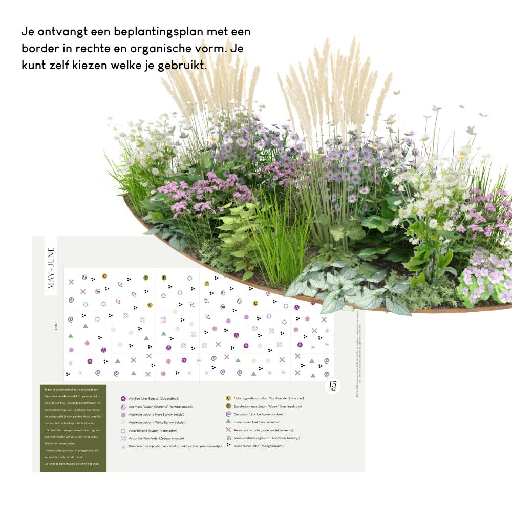 Elk borderpakket is ontworpen door tuinontwerper, schrijver en MAY & JUNE-oprichter Judith van Lent. Ze staat bekend om haar lagentheorie. Elke plant heeft een specifieke rol binnen een beplantingsplan in één van de vier lagen: structuurlaag, seizoenslaag, bodemlaag en vullerlaag. De borderpakketten zijn daarmee professioneel ontwikkeld. Waar andere partijen simpelweg vijf soorten planten in grote groepen bij elkaar zetten, is dit een beplantingsplan met dezelfde zorg en expertise waarmee we al jaren tuinliefhebbers helpen. En dat voor een heel vriendelijke prijs mét planten!