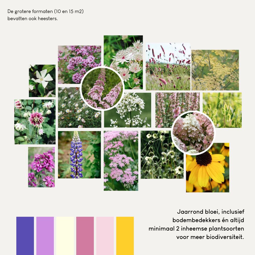Let op: voor Wimborne geldt dat je in de schoongekweekte variant óók heesters in de samenstelling vindt voor de grotere formaten, maar in de biologische niet. De reden is dat we nog geen gecertificeerde biologische struiken kunnen aanbieden. Daarom zitten er in de biologische varianten weer meer vaste planten.