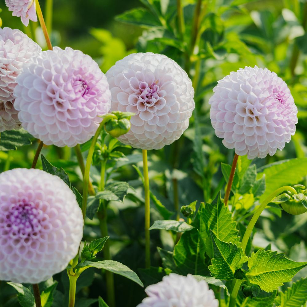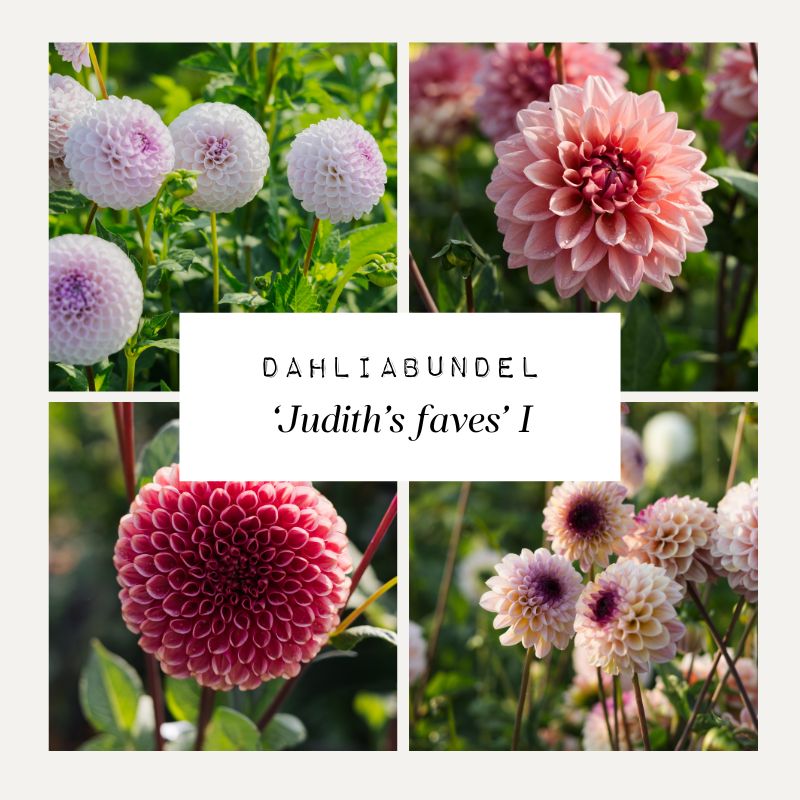 In deze bundel met vier soorten dahlia's heeft Judith een favoriete combinatie bedacht die ze graag in de tuin gebruikt. Elke soort heeft een andere vorm en kleur, die harmonieus op elkaar aansluiten. Samen kunnen ze mooie plukboeketten vormen, zeker als je ze aanvult met eenjarige bloemen en schermen. Elke knol heeft ongeveer een halve vierkante meter ruimte nodig.