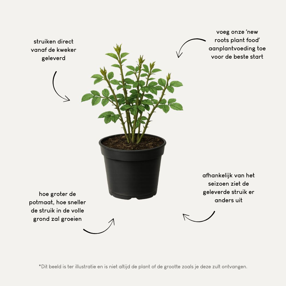 Na aankoop ontvang je tips over aanplanten én onderhoud in je e-mail. Zo ben je goed voorbereid op de komst van je struiken. En geen zorgen als je ze niet meteen in de grond kunt zetten: ze kunnen prima nog een paar weken buiten in hun pot blijven staan zolang je ze water blijft geven als dat nodig is.